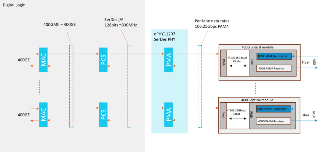 為了應對HPC等大算力應用帶來的挑戰(zhàn),晟聯科112G SerDes跟光模塊配合實現Chip-to-Chip高速互連,讓分布式運行的多Die集成為一顆高性能運行的芯片,做到低延時,高速度。同時支持同構和異構集成HPC芯片架構,并提供優(yōu)秀的產品性能表現。