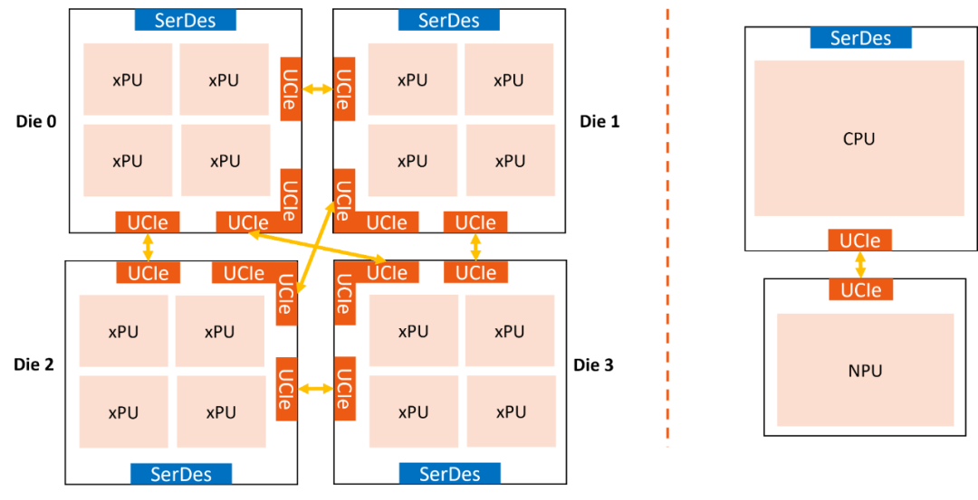 UCIe+SerDes IP的使用方式主要有2種,一種是UCIe+SerDes IP跟xPU集成在同一個Die里,Die和Die之間采用同構或者異構的集成方式。