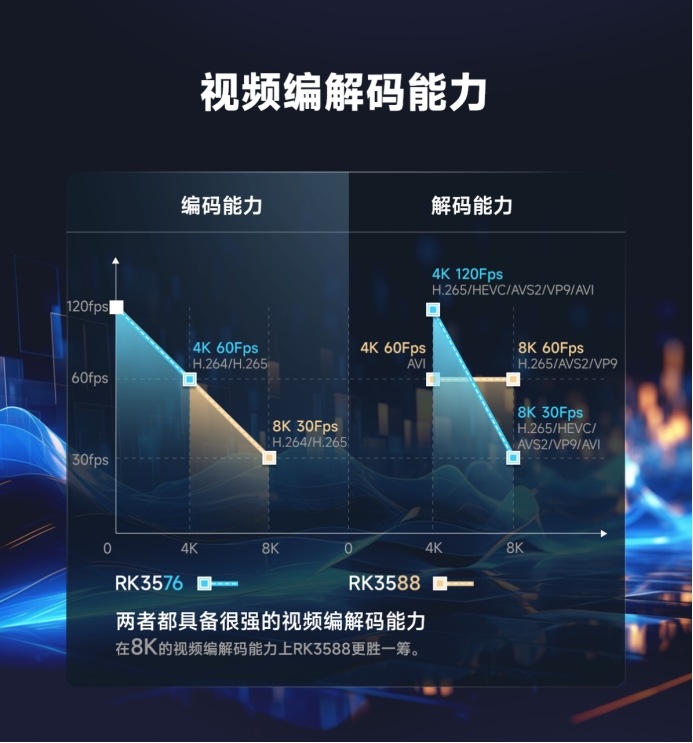 編碼能力RK3588最高支持8K@30fps H.264/H.265,RK3576最高支持4K@60fps H.264/H.265。解碼能力RK3588支持最高8K@60fps H.265,RK3576