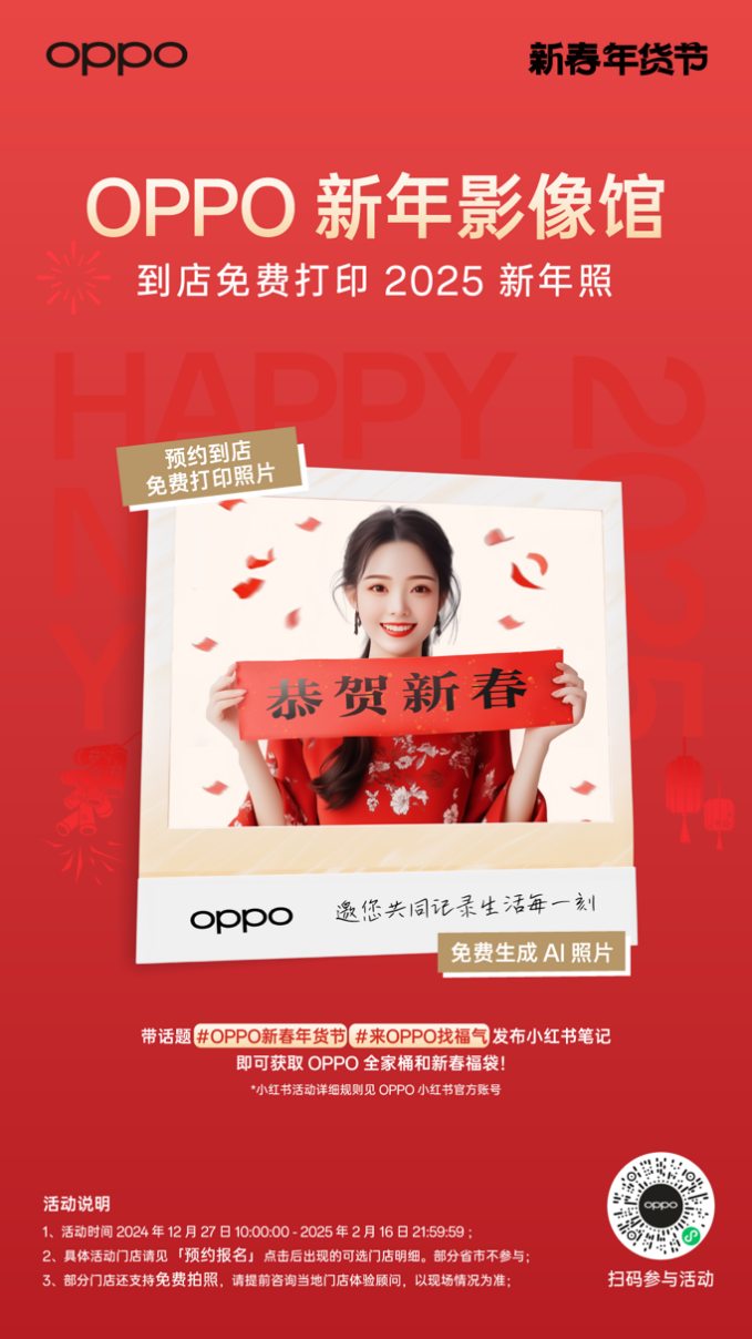 12月27日至2月16日,前往 OPPO 會員小程序、OPPO商城或通過OPPO線下門店海報掃碼進入OPPO新年影像館活動,可免費生成AI新年照,預約到店還能免費打印裝裱新年照;另外參與限時快閃活動,除現(xiàn)場免費拍攝新年照外,更有參與互動再贏好禮!