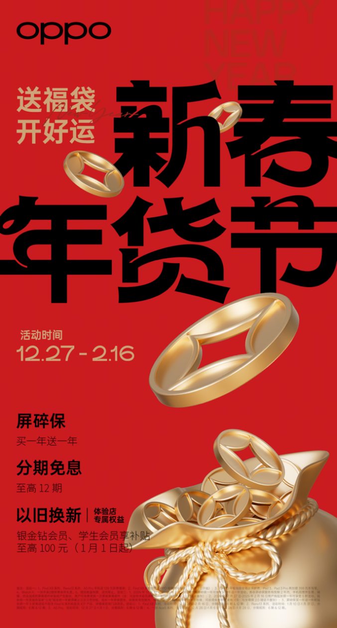 即日起至2025年2月16日,用戶可前往OPPO官方授權(quán)體驗店及線上官方旗艦店,購指定產(chǎn)品即送新春福袋,為新春增添一份節(jié)日氛圍。