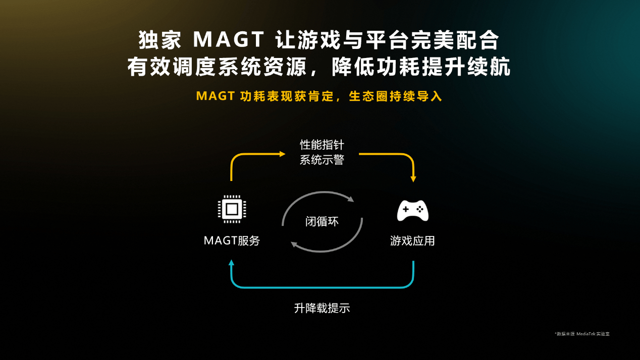 星速引擎自適應(yīng)技術(shù)MAGT是聯(lián)發(fā)科技提供的一套框架(Framework),可以讓游戲通過SDK與SoC底層實時交換訊息。通過該框架,游戲可以與平臺進行高效調(diào)度,比如通過提供CPU、GPU、溫度、功耗及系統(tǒng)狀態(tài)指針,讓游戲應(yīng)用的參數(shù)根據(jù)設(shè)備的系統(tǒng)狀態(tài)進行動態(tài)調(diào)整,從而實時優(yōu)化游戲運行效率,達到持續(xù)穩(wěn)定高幀率的同時,降低功耗、提升設(shè)備續(xù)航時間的目的。