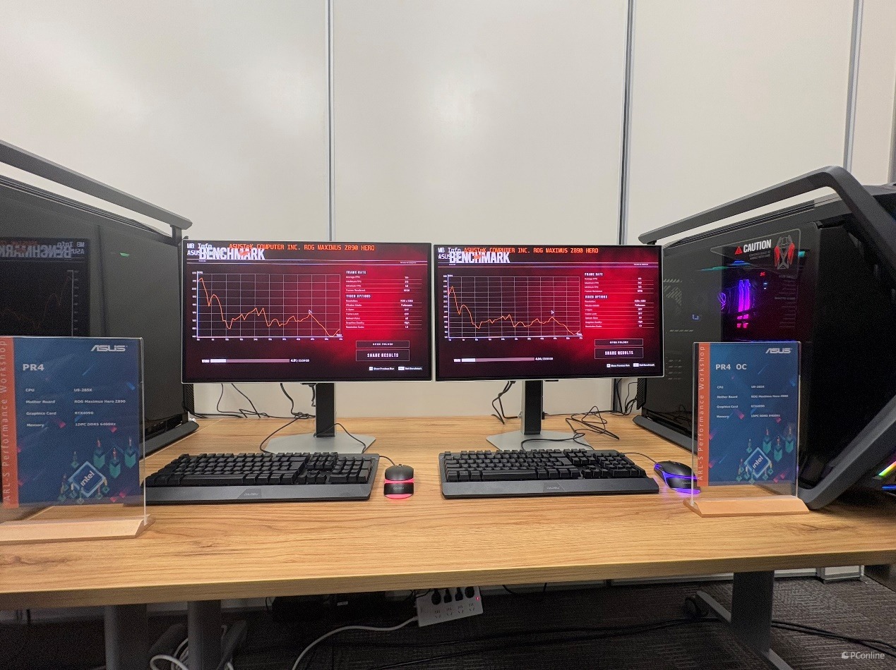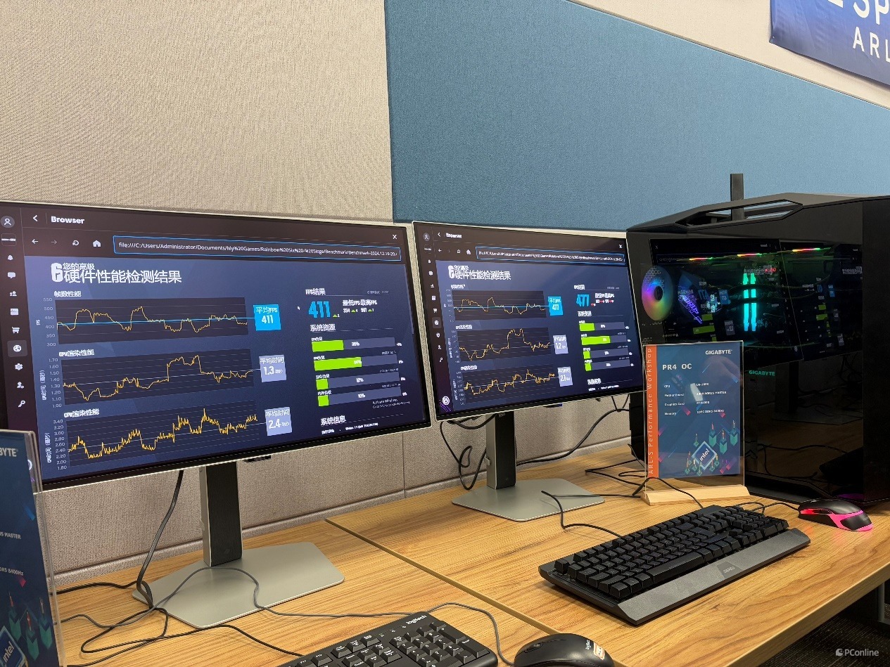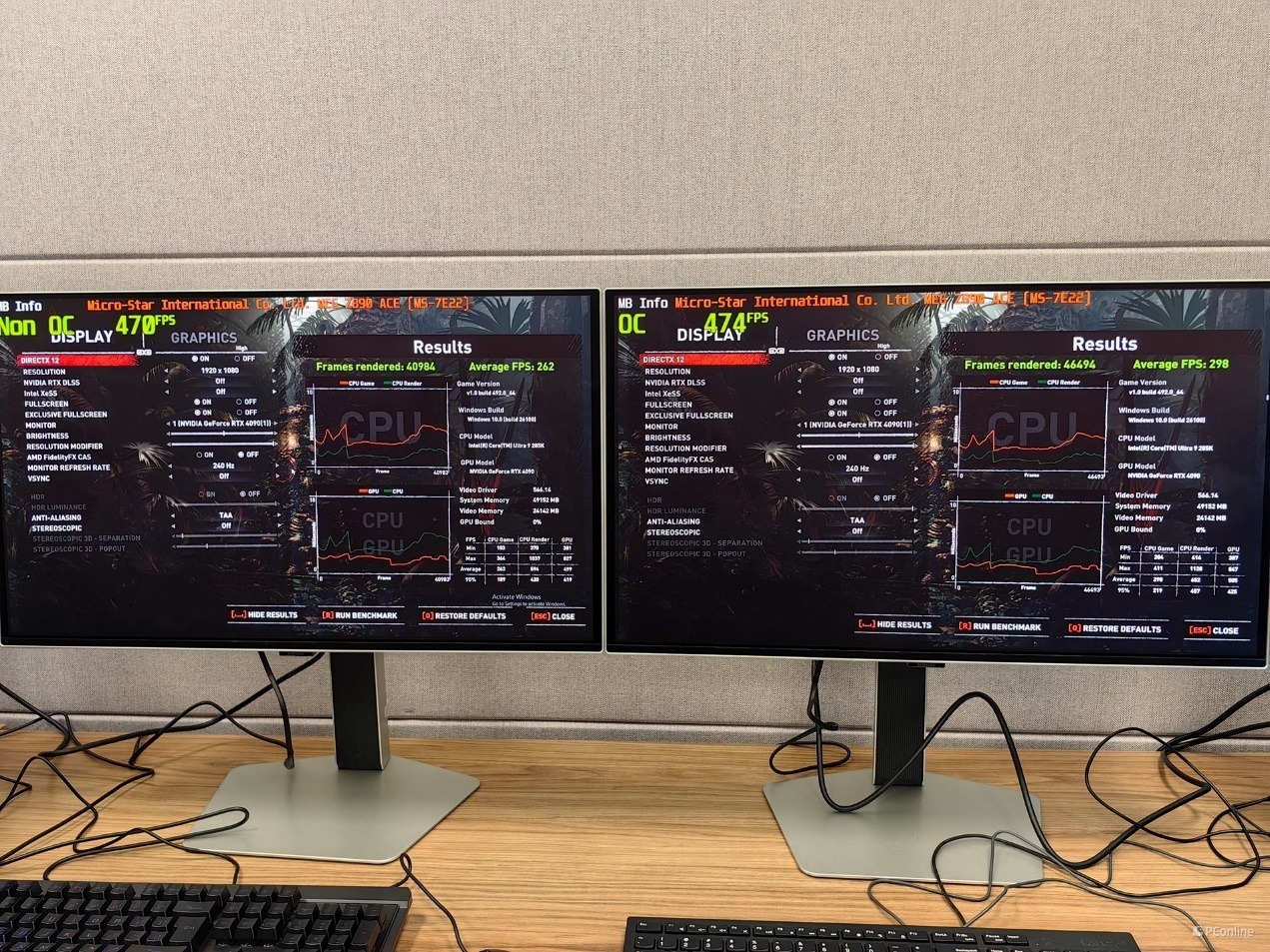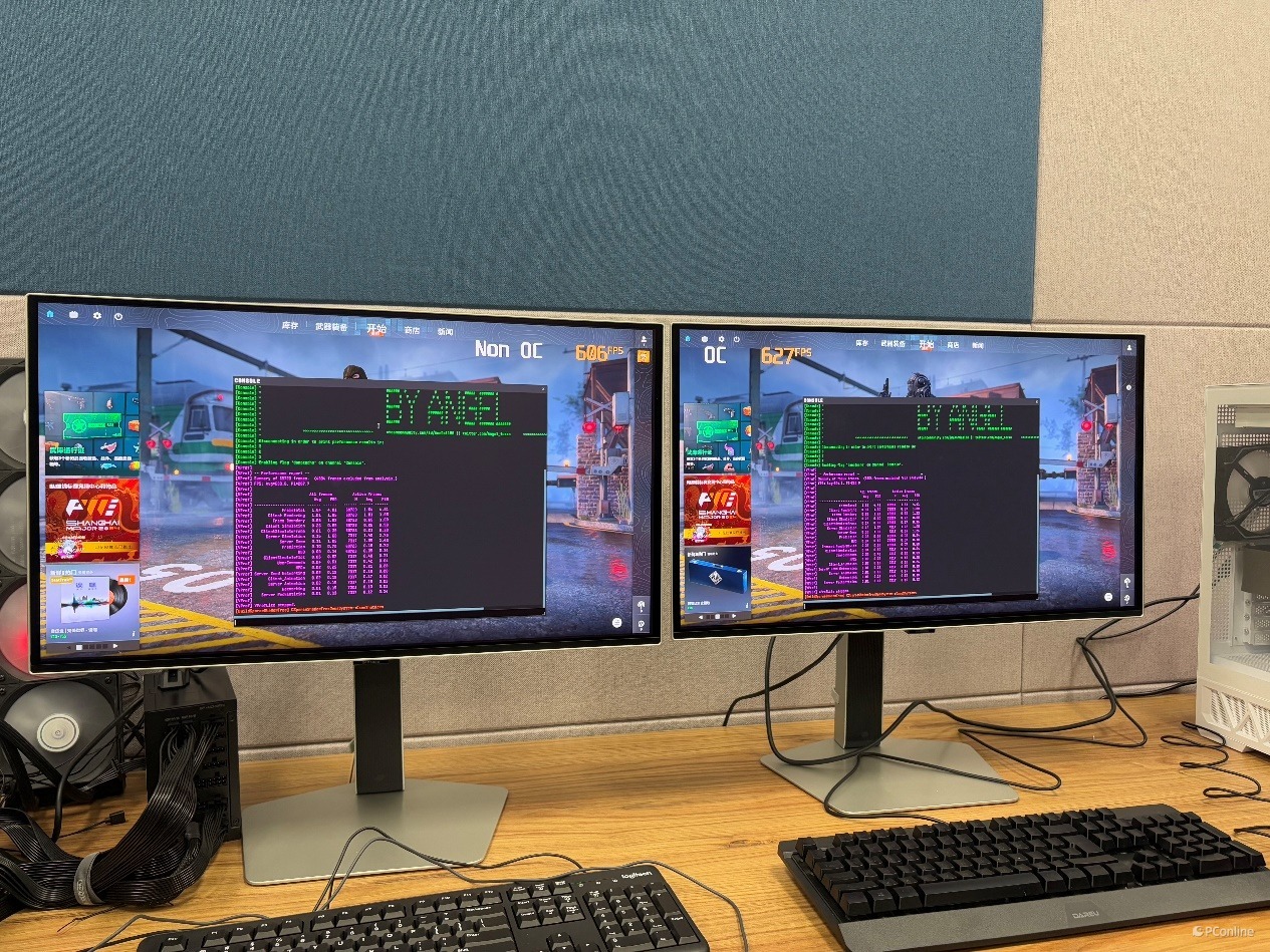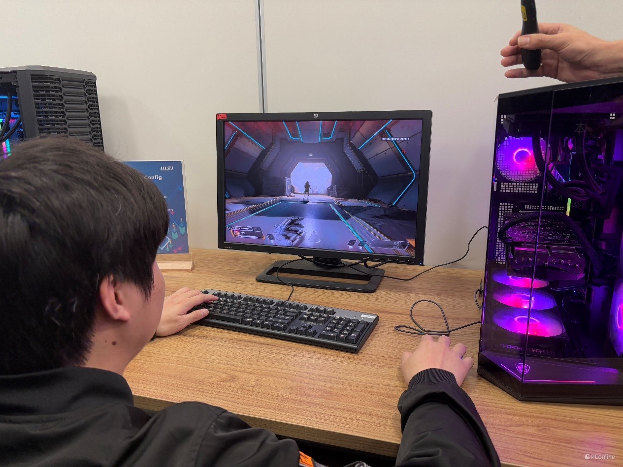 既然說到酷睿Ultra 200S能夠輕松做到8000+MHz的內(nèi)存頻率,下面不妨看看Intel在現(xiàn)場演示的Demo,究竟高頻內(nèi)存能夠帶來怎樣的性能增益。以下測試的硬件配置完全一致,僅內(nèi)存頻率的差距,左邊為DDR5-6400MHz,而右邊則是DDR5-8400MHz。