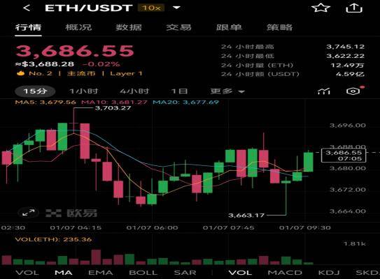 以太坊ETH今日實時價格行情分析預測,從歐易OKX交易軟件平臺提供的數(shù)據(jù)來看,截至[2025年1月7日],以太坊ETH最新價格為3,686.55美元,較前一交易日略有下降,跌幅為0.02%。在24小時內(nèi),以太坊ETH最新價格最高價達到3,745.12美元,最低價為3,622.22美元,24小時交易量為12.49萬ETH,交易額達到4.59億美元。