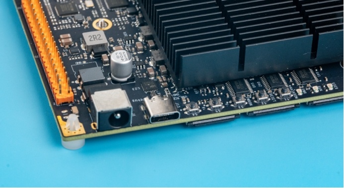 背面是M.2硬盤接口、SD卡槽、3組4 lane的MIPI CSI攝像頭輸入接口,以及一個(gè)MIPI DSI顯示輸出接口。