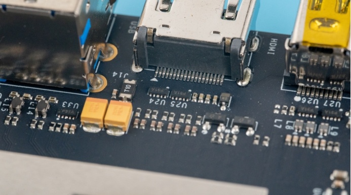 板子依然是米爾最經(jīng)典的配色,啞光黑色油墨+焊盤沉金工藝,看著逼格拉滿。SOC模組上加了一個(gè)很大的散熱器。一側(cè)是音頻、Mini DP、HDMI、兩個(gè)USB3.0口、兩個(gè)以太網(wǎng)接口等。