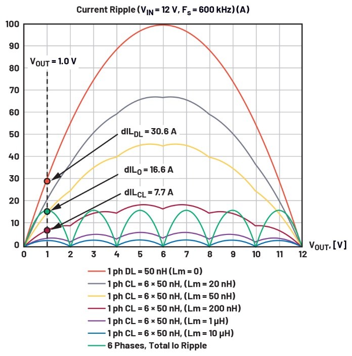 圖6.計(jì)算六相VIN = 12 V降壓(Fs = 600 kHz)的電流紋波與VOUT的關(guān)系,使用50 nH的電感和不同的Lm值??傒敵鲭娏骷y波顯示為綠色,所有Lm值均相同。