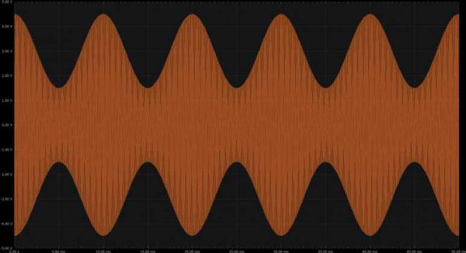 要生成AM信號,請使用Scopy信號發(fā)生器中的數(shù)學(xué)函數(shù)。將記錄長度設(shè)置為50 ms,并應(yīng)用以下函數(shù):(1 + 0.5 × cos (2 × pi × 100 × t)) × 3 × cos (2 × pi × 100 × 100 × t)。生成的波形如圖11所示(顯示了5個(gè)周期)。