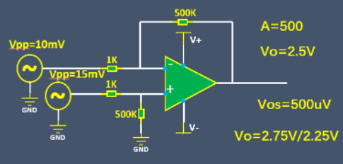 運放的失調電壓的影響主要是當我們在做小信號的運算,失調電壓就不能忽略了,會帶來一定的誤差。比如如下的加減運算放大電路,本來輸出應該是2.5V,但是實際輸出電壓仿真是2.75V或者2.25V。