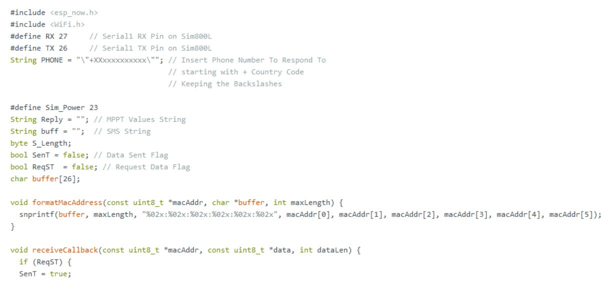 短信只從草圖中識別的手機(jī)接收,請求命令被發(fā)送到連接到MPPT的ESP 32單元。T-Call等待,直到它接收到數(shù)據(jù)并將其作為SMS消息發(fā)送到電話。