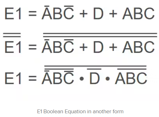 有了最終的布爾方程E1 = āBC′s + D + ABC,我們可以進(jìn)一步簡化它,使其更容易轉(zhuǎn)換為NAND門電路。使用雙補(bǔ)語和德摩根定理就可以做到這一點(diǎn)。