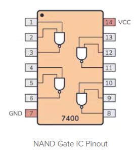 TinkerCAD電路也用于在面包板上構(gòu)建電路,因此我可以在稍后的構(gòu)建過程中輕松地復(fù)制它們。該軟件沒有單獨(dú)的NAND門組件,但它有這些稱為ic(集成電路)的黑色塊,這些特定的ic有4個帶有這些引腳的NAND門,如下所示。