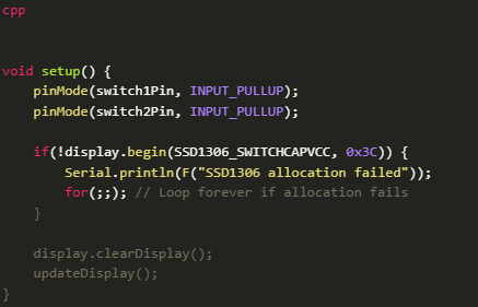 在設置功能中:開關的引腳設置為帶有內(nèi)部上拉電阻的輸入模式。初始化OLED顯示屏。如果失敗,程序將無限循環(huán)。將清除并更新顯示以顯示初始值。