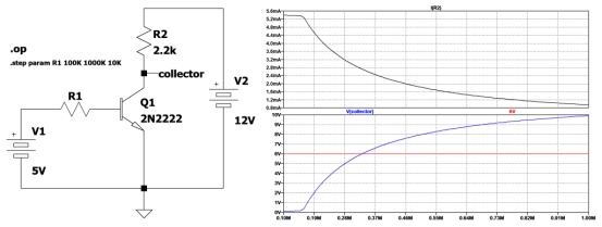 這兩個(gè)圖代表了晶體管在電路中相對(duì)于通過基阻流動(dòng)的電流的行為。上圖顯示電流通過電路的負(fù)載電阻流動(dòng),因?yàn)榛髯兓?。坐?biāo)軸(y-軸)代表以毫米為單位的電流,而橫坐標(biāo)軸(x-軸)代表電阻R1的值。底部圖顯示的電壓在收集器;同樣,隨著基礎(chǔ)電阻變化.坐標(biāo)軸(y軸)代表電壓,而橫坐標(biāo)軸與第一個(gè)圖相同,并顯示參數(shù)R1。如你所見,收集器電壓為VCC/2的理想點(diǎn)是基阻值約為331kb,在2.73mA的收集器電流中。能夠觀察電阻值域中的圖表是非常有用的,因?yàn)樗试S用戶仔細(xì)選擇電子元件,而不必運(yùn)行幾個(gè)電子模擬。電容器和電感器也是如此。