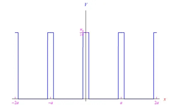 讓我們順便指出,選擇"不對(duì)稱(chēng)方波"類(lèi)型的電位,或更一般地選擇分段常數(shù)函數(shù)的電位,是一種數(shù)學(xué)技巧,使施羅定格方程具有常系數(shù),因此有一個(gè)直接的解。單調(diào)的部分由解的連接條件表示,與電位的有限不連續(xù)性相對(duì)應(yīng)。這些條件返回了一個(gè)先驗(yàn)方程,當(dāng)用數(shù)字/圖形化方法求解時(shí),它提供了能量的特征值。