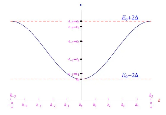 不過(guò), ε ( k )與第2期周期性 π/a ,所以只需將其限制在第一個(gè)布里盧因區(qū)[- π/a, π/a ]。因此: