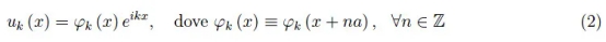 在哪里 ε ( k )是單電子哈密頓算子(即。,能源特征值); E 0 > 0是一個(gè)約束態(tài)的能量, A 是晶格音調(diào),而 k 是電子波的波數(shù)。我們已經(jīng)建立了好幾次(布洛赫定理),上面提到的能量特征函數(shù)是由一個(gè)與晶格具有相同周期的函數(shù)在幅度上調(diào)制的平面波: