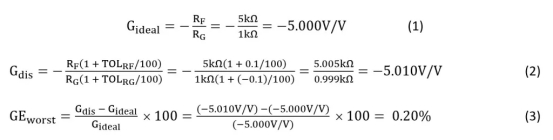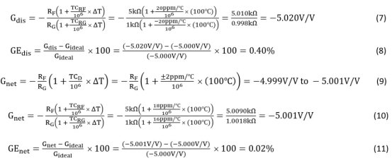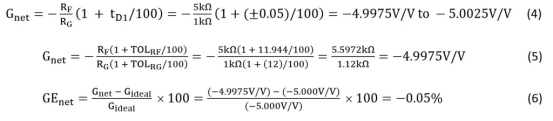 將方程5包括在內僅供說明之用;方程4是計算由公差引起的增益變化的正確方法。方程6給出了增益誤差的計算,它明顯低于離散的0.1%電阻器選項。