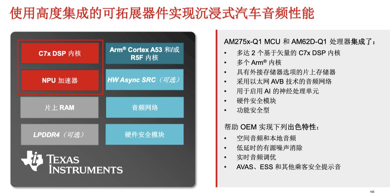 隨著汽車從出行工具轉(zhuǎn)變?yōu)椤暗谌羁臻g”,車內(nèi)音頻系統(tǒng)的作用愈發(fā)重要。從沉浸式3D立體聲到語音交互,再到主動降噪和安全提示,智能座艙對音頻技術(shù)提出了更高的要求。這些需求不僅要求更強(qiáng)的音頻處理能力,還需要兼顧復(fù)雜算法的高效運(yùn)行與整體系統(tǒng)的低成本。這一背景下,TI最新發(fā)布的AM275x-Q1和AM62D-Q1兩款芯片,以及TAS6754-Q1功放產(chǎn)品,正是為滿足這些新需求而生的技術(shù)突破。