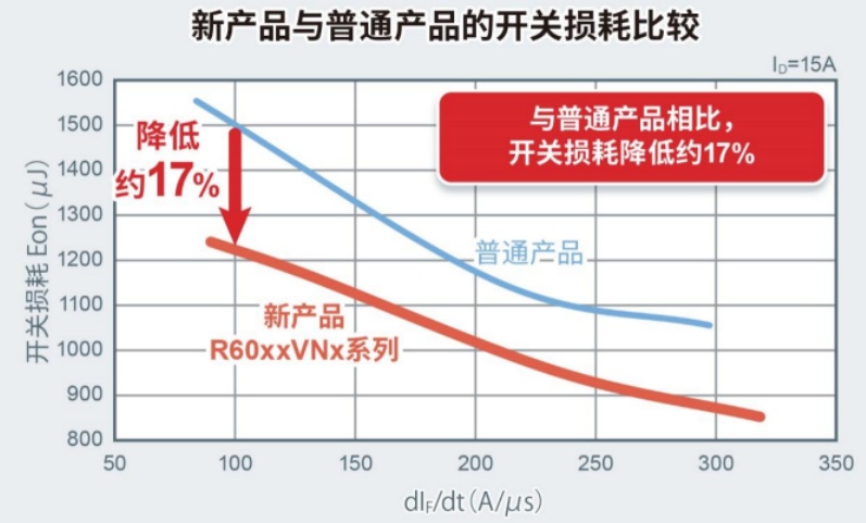 圖5:R60xxVNx系列與普通產(chǎn)品的開(kāi)關(guān)損耗比較