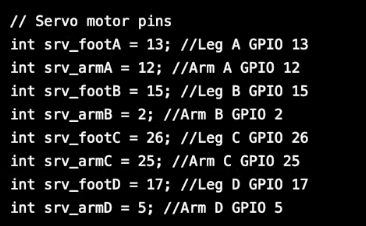 在本節(jié)中,我們指定伺服電機連接的GPIO引腳。機器人的每條手臂和腿都由單獨的伺服電機控制。