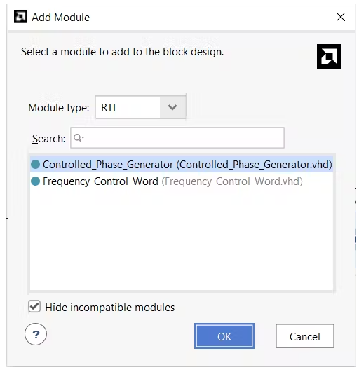 從GitHub存儲(chǔ)庫(kù)下載這兩個(gè)VHDL文件,并將它們作為新源添加到項(xiàng)目中。接下來(lái),右鍵單擊塊設(shè)計(jì)并將FCW和相位累加器作為模塊添加到您的設(shè)計(jì)中。