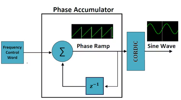 這個(gè)框圖代表了一個(gè)數(shù)控振蕩器(NCO),它被用來(lái)產(chǎn)生一個(gè)頻率可變的數(shù)字正弦波。NCO的主要組成部分是:頻率控制字(FCW)、相位累加器和CORDIC IP。
