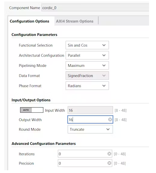 從IP目錄中,向設(shè)計(jì)中添加CORDIC IP塊。修改CORDIC輸出功能以生成正弦和余弦值。