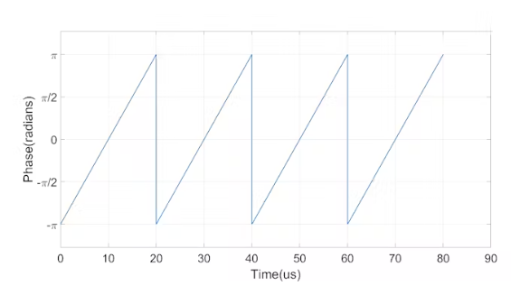 相位累加器輸出增加到π,然后休息到-π。鋸齒波的斜率取決于fw