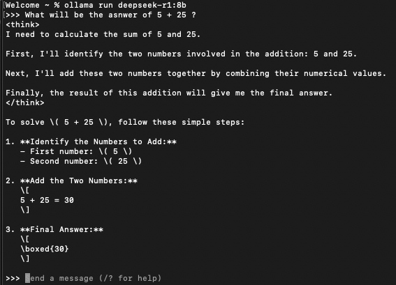 5。模型可能需要花費(fèi)一些時(shí)間才能下載,因?yàn)樗鼈冃枰螺d。模型運(yùn)行后,您應(yīng)該能夠在終端中提出一個(gè)問題并獲取輸出。您可以參考下面的插圖,以查看行動(dòng)中的DeepSeek R1 8B模型。