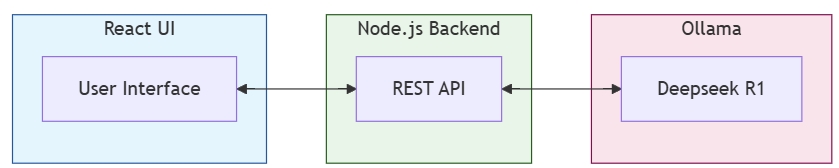 基于React的用戶界面使用REST API與基于NODEJS的后端進(jìn)行通信。然后,Nodejs后端將用戶請(qǐng)求發(fā)送到使用Ollama托管的DeepSeek R1。整個(gè)技術(shù)堆??梢栽趩闻_(tái)計(jì)算機(jī)上運(yùn)行,就像您在整個(gè)文章中所做的那樣,也可以在更復(fù)雜的用例中托管多個(gè)容器。