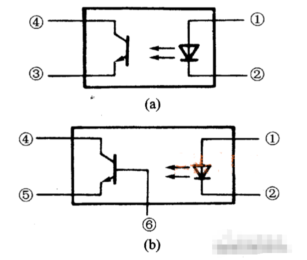 1)四引腳的光耦合器的輸入端為個發(fā)光二極管,一般由砷化嫁發(fā)光一極、磷化饋或磷砷閘化嫁等發(fā)光二極擔任,①腳為正極,②腳為負極。輸出端為光敏晶體管,③腳為光敏晶體管的發(fā)射極,④腳為光敏晶體管的集電極。