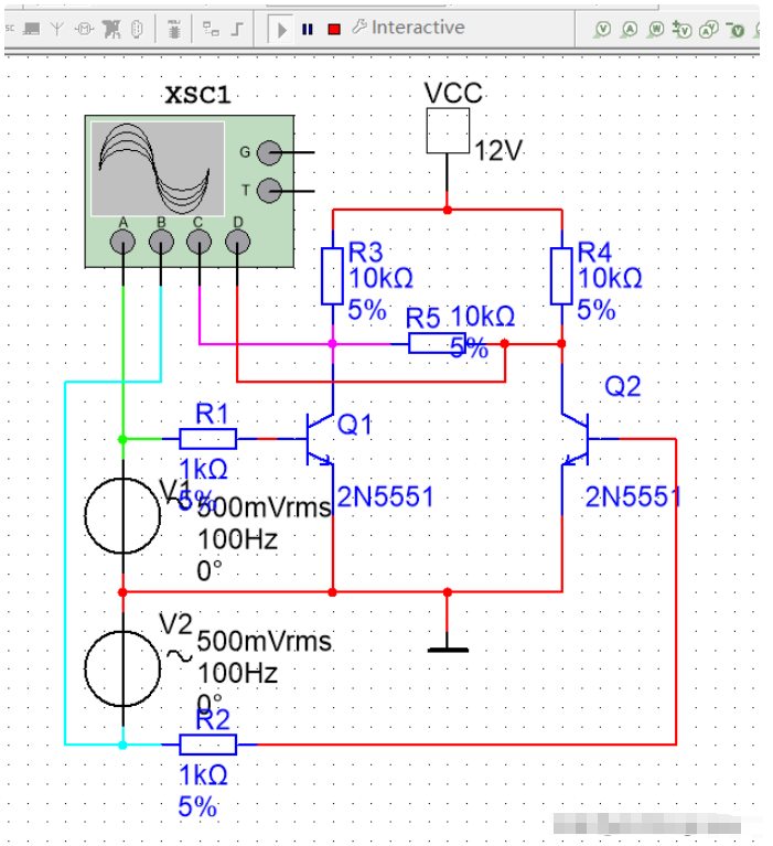 差分式放大電路是基本的直接耦合放大電路。雙擊示波器圖標(biāo),調(diào)節(jié)X軸掃描為2mS/Div,A通道Y軸幅度2V/Div,偏置2;B通道Y軸幅度2V/Div,偏置1;C通道AC,Y軸幅度10V/Div,偏置-1;D通道AC,Y軸幅度10V/Div,偏置-2。打開電源開關(guān),即可以觀察到兩個(gè)輸入信號(hào)和兩個(gè)輸出信號(hào)的波形。容易看出,由于偏置太小,輸出波形有明顯的失真。