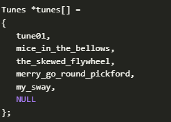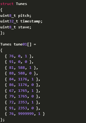 首先,我們?yōu)橐粋€(gè)音符事件定義Tunes結(jié)構(gòu)。然后我們將一個(gè)曲調(diào)定義為音符事件的數(shù)組。最后一個(gè)元素的時(shí)間戳為9999999,作為曲子結(jié)束的標(biāo)志(鍵和五線譜編號無關(guān))。我可以隨意命名一個(gè)曲調(diào)數(shù)組。在主程序中,我有一個(gè)指向這些曲調(diào)的指針數(shù)組: