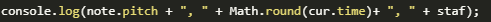 Cur是一個(gè)游標(biāo)對象,它指向樂譜中的一個(gè)元素。它可以是休止符,和弦或者別的什么。我從游標(biāo)對象讀取時(shí)間,并將其舍入到毫秒(沒有人會注意到亞毫秒級的錯(cuò)誤)。和弦由一個(gè)或幾個(gè)音符組成。插件遍歷嵌套循環(huán),最外面的遍歷所有五線譜,下一個(gè)遍歷一個(gè)五線譜中的所有和弦,最里面的遍歷一個(gè)和弦中的所有音符。因此,音調(diào)的音高或中音數(shù)可以從音符對象中讀取,而時(shí)間則從光標(biāo)對象中讀取。在我的代碼中,五線譜數(shù)(它轉(zhuǎn)移到木槌數(shù))保存在五線譜變量中。運(yùn)行此插件將在插件工具的控制臺窗口中顯示一個(gè)列表(必須在Musescore中打開)。清單看起來是這樣的: