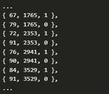 第一個(gè)數(shù)字是音調(diào)的中音數(shù)字。第二個(gè)數(shù)字是以毫秒為單位的時(shí)間戳,第三個(gè)數(shù)字是哪個(gè)木槌在敲擊,1代表低音,0代表距離。數(shù)據(jù)結(jié)構(gòu)將來可能會改變,如果我想把速度作為一個(gè)參數(shù),來改變音樂的動態(tài)。沒有音符事件,因?yàn)椴槔锢Z只是敲擊小節(jié),而不會在之后減弱它們。