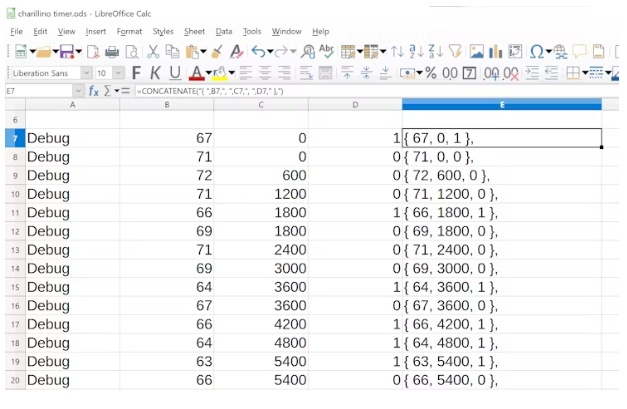 當(dāng)我從Musescore中的控制臺復(fù)制數(shù)據(jù)時(shí),我將其粘貼到單元格A7中。重要的數(shù)據(jù)放在B、C和D列。在根據(jù)C列(時(shí)間戳)對所有內(nèi)容進(jìn)行排序之后,我在E列中創(chuàng)建代碼,并將其直接復(fù)制到Arduino IDE項(xiàng)目中的char伊利諾_tune .h文件中。對于新曲調(diào),我刪除a列中的內(nèi)容,將新數(shù)據(jù)粘貼到A7中并再次排序(a列現(xiàn)在顯示新列表的長度)。E列很好地更新了自己,如果新的曲調(diào)比以前的更長,我只需要擴(kuò)展它。