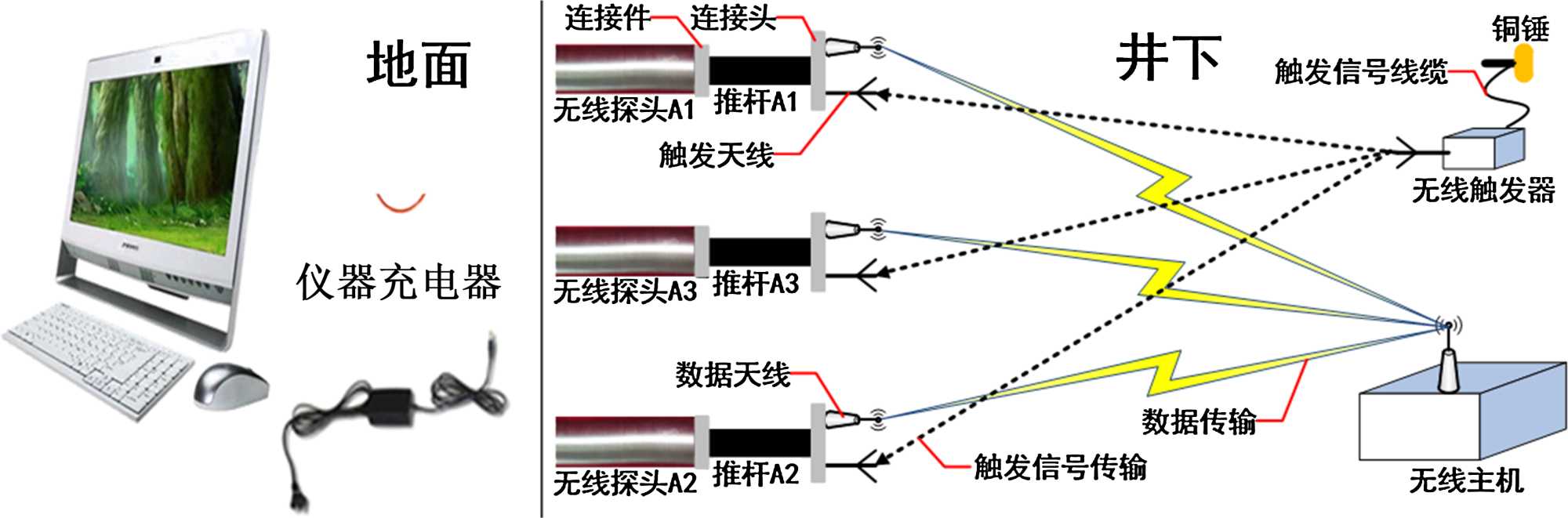 巷道掘進(jìn)中孔中地震高精度預(yù)報(bào)系統(tǒng)是由“井下”和“地面”兩大部分組成的。其中,井下部分主要是由1個(gè)無(wú)線主機(jī)、3個(gè)無(wú)線探頭、1個(gè)無(wú)線觸發(fā)器、1個(gè)震源銅錘、1個(gè)錘墊、1根觸發(fā)信號(hào)線以及其它配件(如:蜂鳴器等)組成。主要功能是進(jìn)行現(xiàn)場(chǎng)數(shù)據(jù)采集和存儲(chǔ),井下設(shè)備都是本質(zhì)安全型設(shè)計(jì),并且通過(guò)了國(guó)家煤礦安全機(jī)構(gòu)的防爆性能檢測(cè)和安全認(rèn)證。地面部分主要是由PC機(jī)、儀器電源適配器(充電器)和分析軟件組成的,其主要功能是對(duì)所采集的地質(zhì)數(shù)據(jù)進(jìn)行轉(zhuǎn)儲(chǔ)、深度解析、分析處理和形成成果報(bào)告文件,亦即預(yù)報(bào)結(jié)果。預(yù)報(bào)系統(tǒng)組成設(shè)計(jì)如圖1所示。