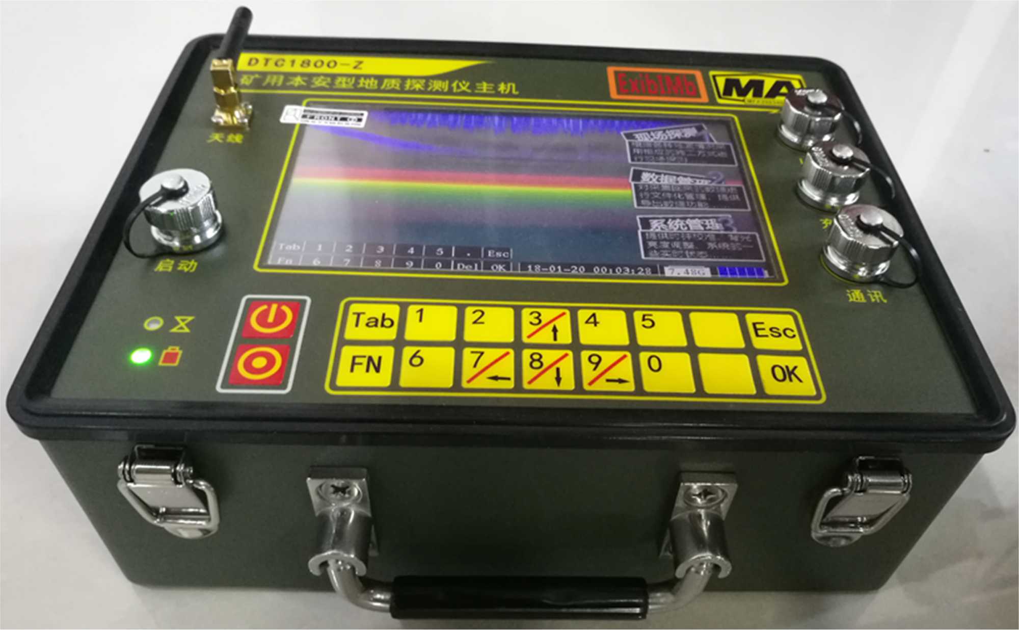 巷道掘進(jìn)中孔中地震高精度預(yù)報(bào)系統(tǒng)無(wú)線主機(jī)組成主要包括:主板、液晶顯示、面板、錳酸鋰電池組、無(wú)線路由器、WIFI模塊、2.4 G-WIFI天線、外殼、密封圈、電池盒、托架等,如圖2所示為無(wú)線主機(jī)外觀示意圖。