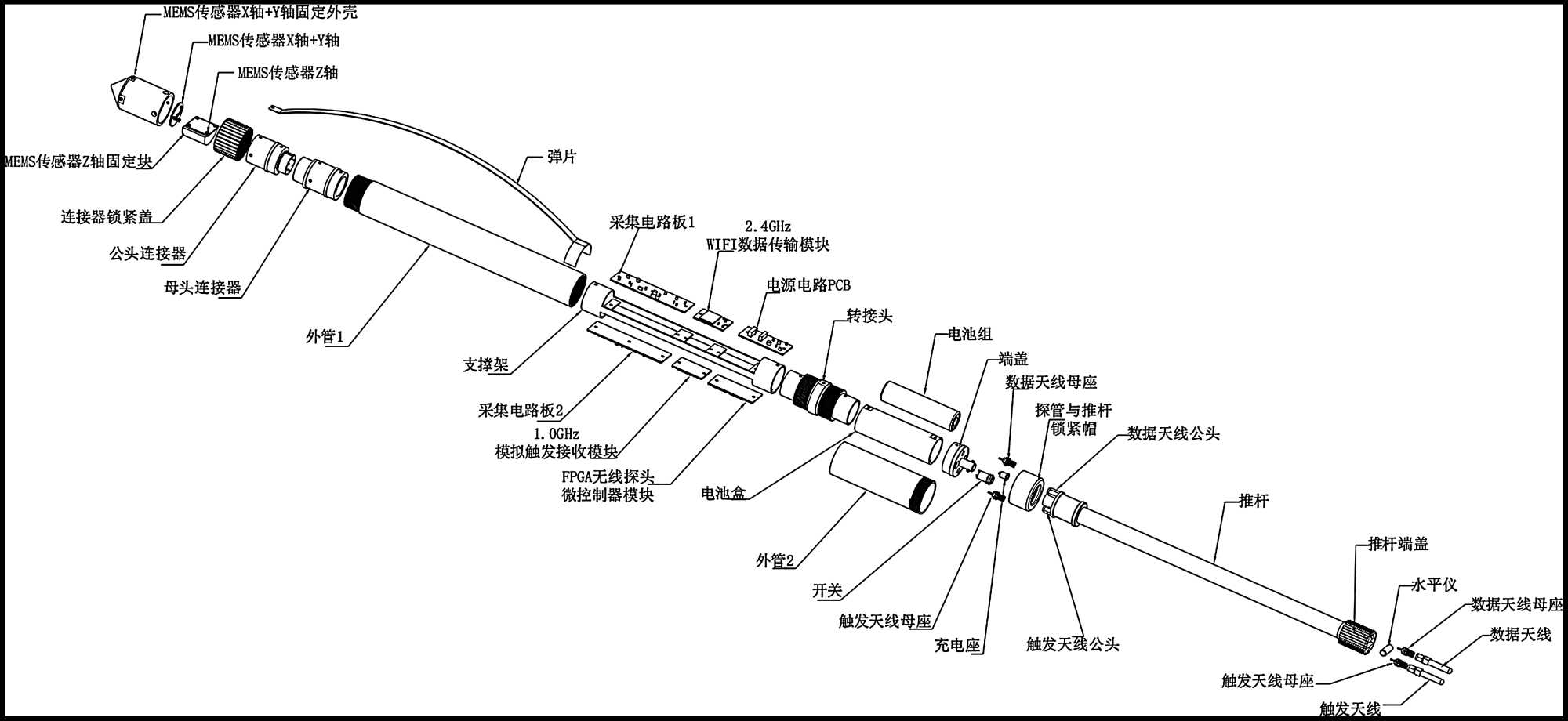 巷道掘進(jìn)中孔中地震高精度預(yù)報(bào)系統(tǒng)中的無(wú)線探頭主要包括:MEMS三分量加速度傳感模塊、信號(hào)處理采集模塊、2.4 GHz-WIFI無(wú)線數(shù)據(jù)傳輸模塊、1.0GHz無(wú)線模擬接收模塊、電源電路、錳酸鋰柱狀電池組、圓柱外殼、圓柱電池盒、推桿、連接部件、天線等。無(wú)線探頭結(jié)構(gòu)如圖3所示,外觀圖如圖4所示。