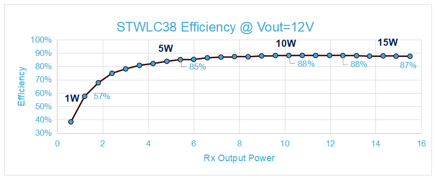 在 5W 至 15W 的功率范圍內(nèi),STWLC38能效在同類產(chǎn)品中表現(xiàn)出眾(圖 3)。