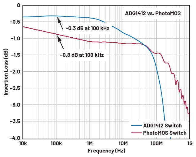 低RON的開(kāi)關(guān)至關(guān)重要。I*R電壓降會(huì)限制系統(tǒng)性能。各器件之間以及溫度變化引起的RON波動(dòng)越小,測(cè)量誤差就越小。圖4中的插入損耗曲線顯示,在100 kHz頻率下,PhotoMOS開(kāi)關(guān)的插入損耗為-0.8 dB,而CMOS開(kāi)關(guān)的插入損耗僅為-0.3 dB。這進(jìn)一步證實(shí)了CMOS開(kāi)關(guān)具有較低的RON (1.5 Ω)。