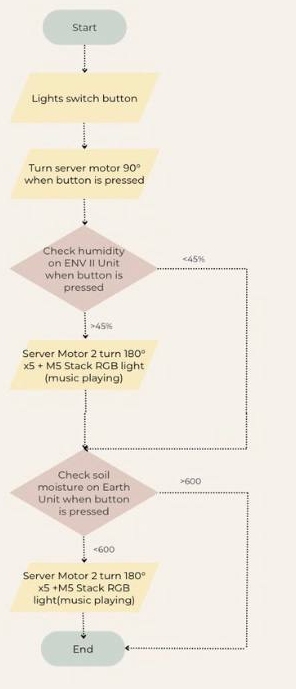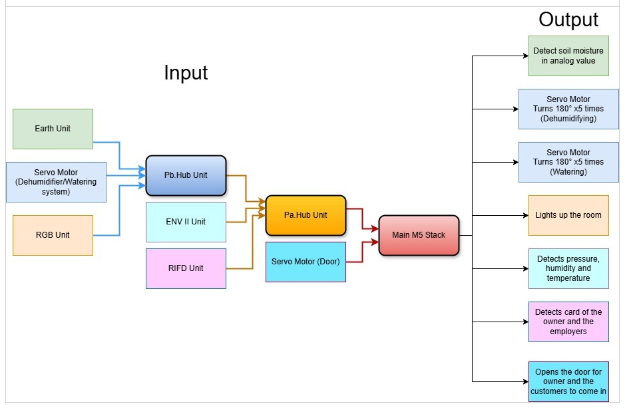 M5Stack ENV II單元使用傳感器來檢測存儲中的濕度水平。當濕度過高時,除濕機會自動啟動,保持適宜的環(huán)境。除濕機收集的水用于植物澆水,由M5Stack接地單元支撐,測量土壤濕度。如果濕度太低,系統(tǒng)會自動開始給植物澆水。