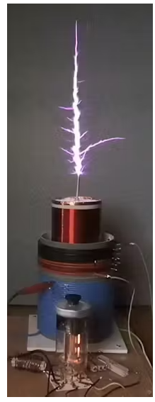 特斯拉線圈設(shè)計(jì)由一個(gè)真空管和幾個(gè)無(wú)源元件由MOT變壓器供電。