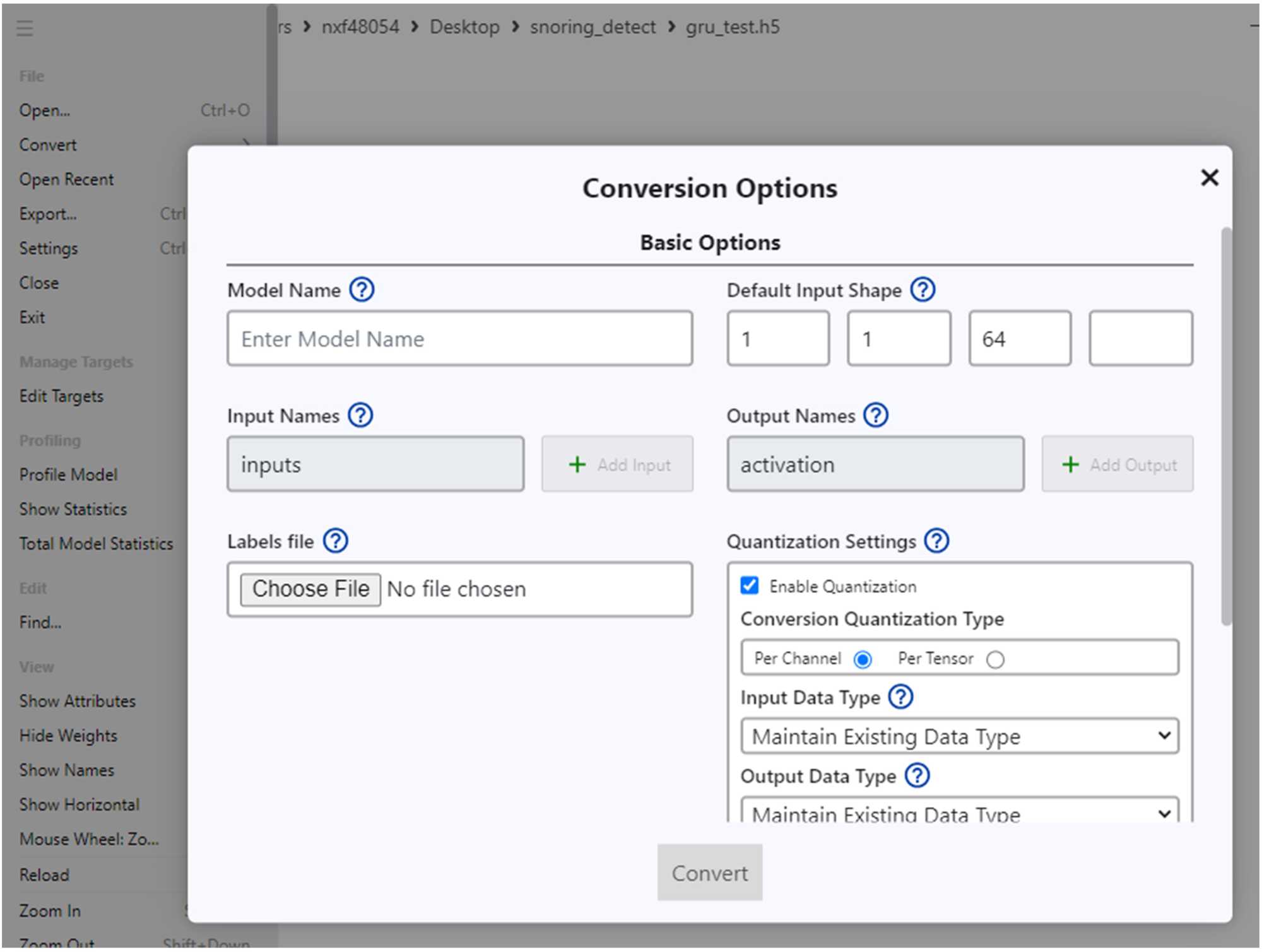 用它打開我們剛才重新制作的模型,點擊左上角的Convert選擇轉換工具為Tensor Flow Lite,并勾選Enable Quantization,如圖5所示。