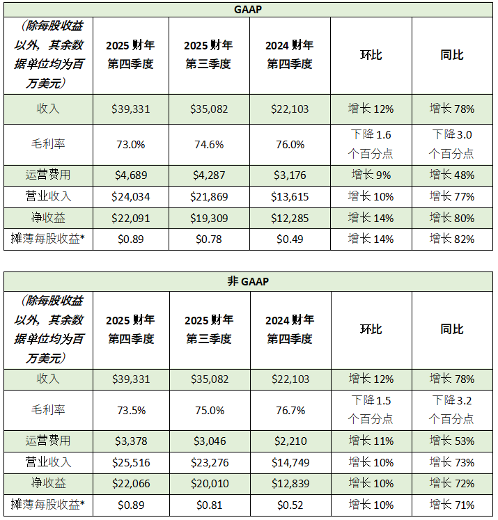 2025 財年收入較上一財年增長 114%,達到 1,305 億美元。全年 GAAP 攤薄每股收益為 2.94 美元,較上一財年增長 147%。全年非 GAAP 攤薄每股收益為 2.99 美元,較上一財年增長 130%。