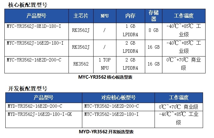 根據(jù)主芯片、存儲(chǔ)器件參數(shù)的不同,MYC-YR3562核心板細(xì)分為3種型號(hào),請(qǐng)從以下列表中選擇最適合您的型號(hào)。其他配置可聯(lián)系銷售代表定制。