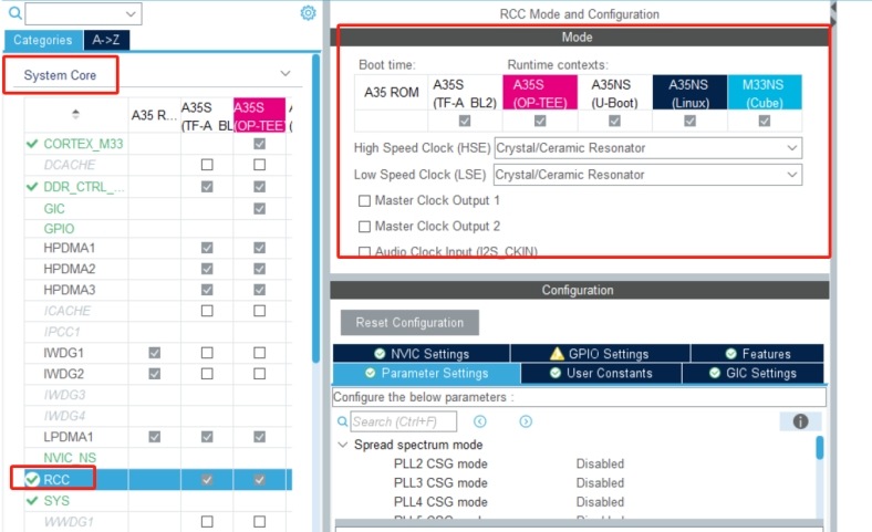RCC, Reset and clock control, RCC 模塊負(fù)責(zé)內(nèi)部時鐘(LSI, HSI 和 CSI)和外部時鐘(LSE 和 HSE)的控制,這些內(nèi)外部時鐘源為硬件模塊直接或間接(通過 PLLs)的提供時鐘信號,核心板的時鐘源: