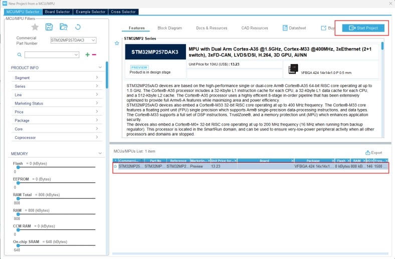 根據(jù)芯片的 part number 選擇正確的芯片封裝開始項目創(chuàng)建,上一節(jié)已經(jīng)看了CPU型號是 STM32MP257DAK3。