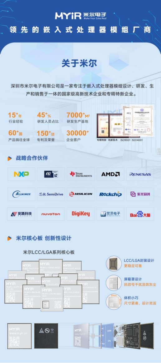 米爾,是一家專(zhuān)注于嵌入式處理器模組設(shè)計(jì)、研發(fā)、生產(chǎn)和銷(xiāo)售于一體的國(guó)家級(jí)高新技術(shù)企業(yè),也被評(píng)為專(zhuān)精特新企業(yè)。米爾電子深耕嵌入式領(lǐng)域10多年,致力于為企業(yè)級(jí)客戶提供基于ARM、FPGA、RISC-V和AI等各種架構(gòu),穩(wěn)定可靠的處理器模組,滿足客戶大批量產(chǎn)品應(yīng)用部署的需求;同時(shí)為客戶提供產(chǎn)品定制設(shè)計(jì)、行業(yè)應(yīng)用解決方案和OEM的一站式服務(wù)。一直以來(lái),米爾電子與ST、TI、NXP、瑞薩、AMD(Xilinx)、瑞芯微、全志、新唐、芯馳、海思、紫光同創(chuàng)等國(guó)內(nèi)外知名半導(dǎo)體廠商保持深度合作關(guān)系,提供專(zhuān)業(yè)高效的服務(wù),助力開(kāi)發(fā)者開(kāi)發(fā)成功,幫助全球數(shù)萬(wàn)家企業(yè)的產(chǎn)品成功上市。